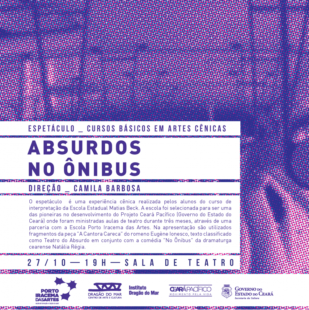 Na próxima terça-feira (27), às 19h, na sala de Teatro da escola Porto Iracema das Artes, acontece o espetáculo “Absurdos No Ônibus”, uma experiência cênica feita a partir do Curso de Interpretação para Teatro realizado na Escola Estadual Matias Beck, resultado de uma parceria entre o Porto Iracema e o programa “Pacto por um Ceará Pacífico”, realizado pelo governo do estado do Ceará.